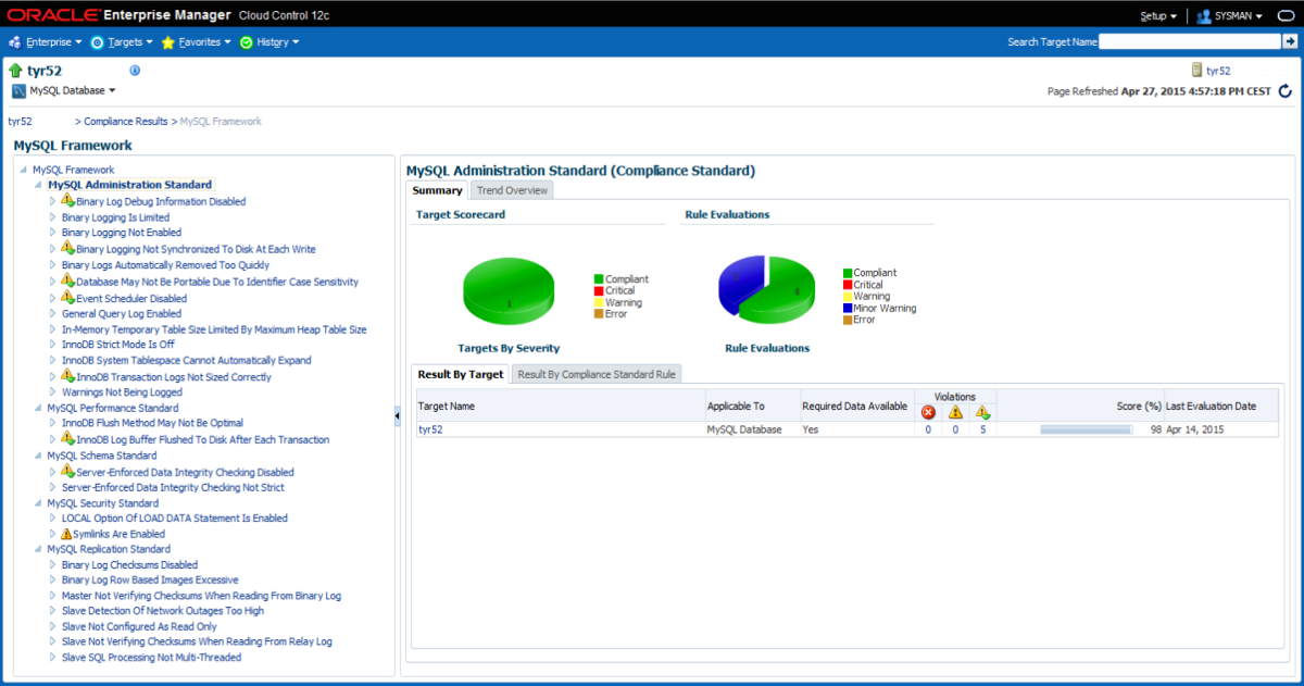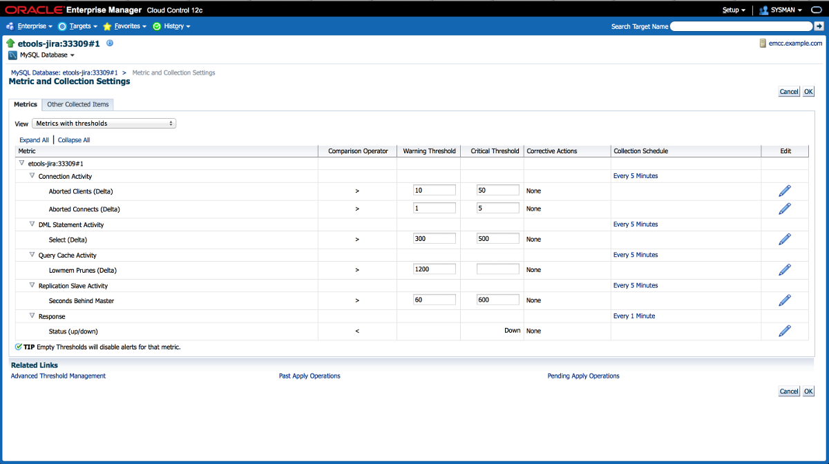 Oracle Enterprise Manager for MySQL collects more than 500 metrics covering various MySQL components. Using the Oracle Enterprise Manager compliance framework, standard rules are used to evaluate pre-defined thresholds and provide advice on how to change configuration parameters to bring your MySQL servers into compliance.