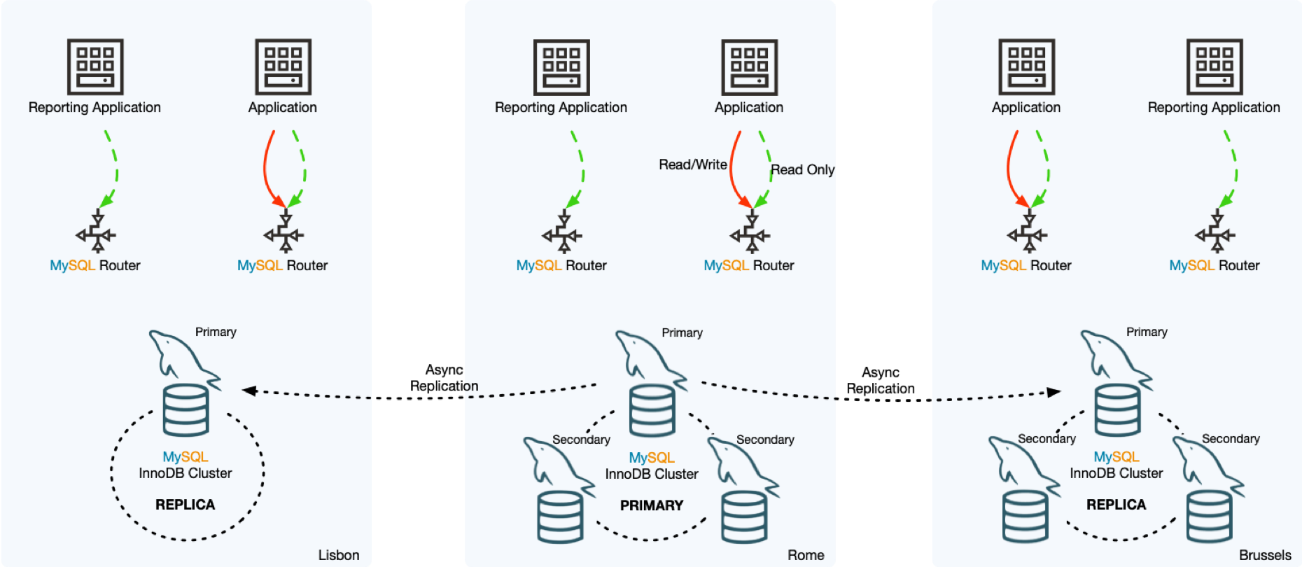MySQL InnoDB ClusterSet provides disaster tolerance for InnoDB Cluster deployments by linking a primary InnoDB Cluster with one or more replicas of itself in different datacenters. InnoDB ClusterSet automatically manages replication from the primary cluster to the replica clusters using a dedicated ClusterSet replication channel. If the primary cluster becomes unavailable due to the loss of the data center or the loss of network connectivity, you can make a replica cluster active instead to restore the availability of the service.