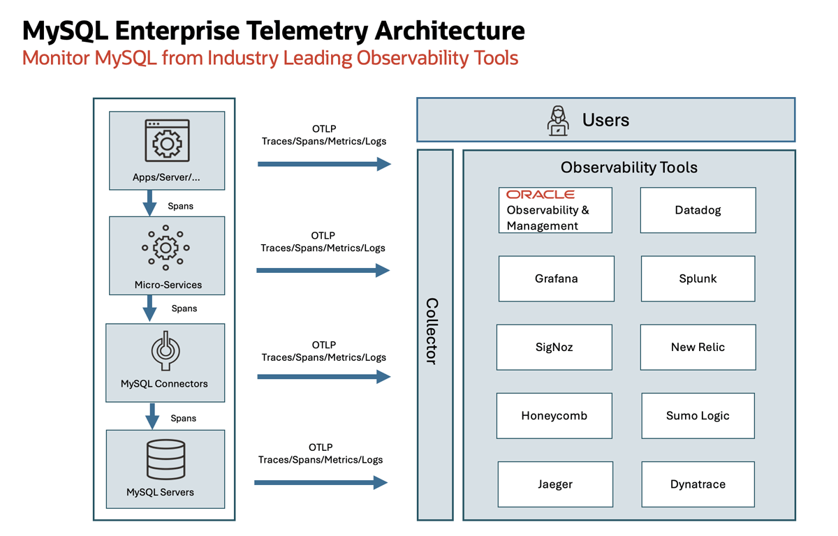 MySQL Enterprise Telemetry allows users to define, create, and collect telemetry data from MySQL to monitor MySQL performance and behavior from a variety of observability and management tools.