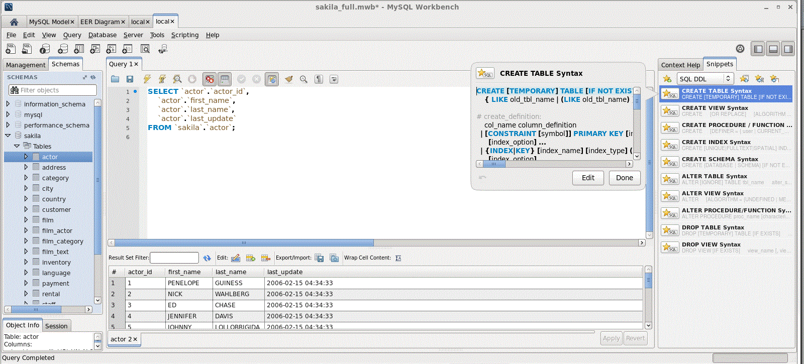 MySQL Workbench gives developers a complete set of visual tools to create, edit, and manage SQL queries, database connections and objects.